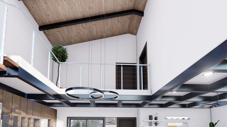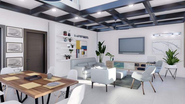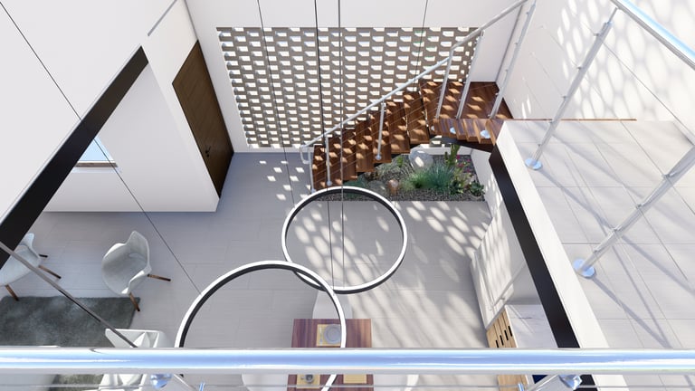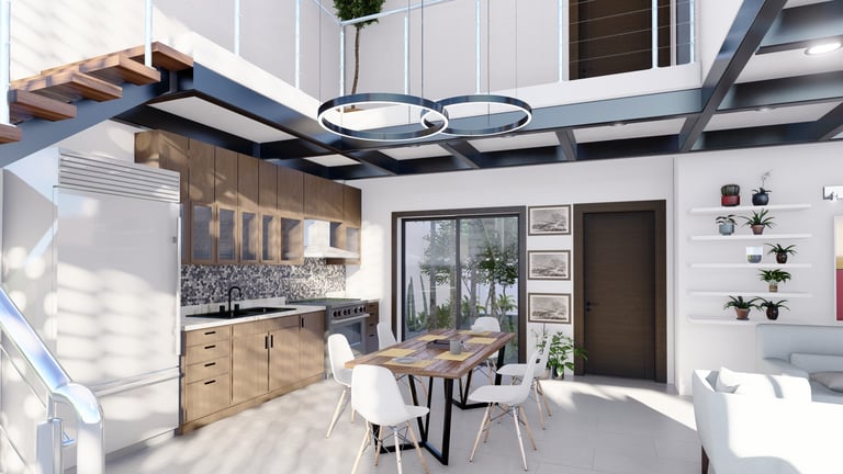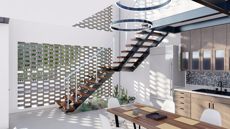 INTERIOR REMODEL PROPOSAL FOR THE LIVING / DINING SPACE AND STAIRS TO THE SECOND STORY, MAKING A DOUBLE-HEIGHT SPACE THE MAIN SPACE ON THE FIRST SIGHT OF THE HOUSE.