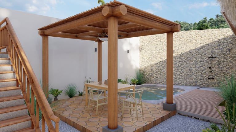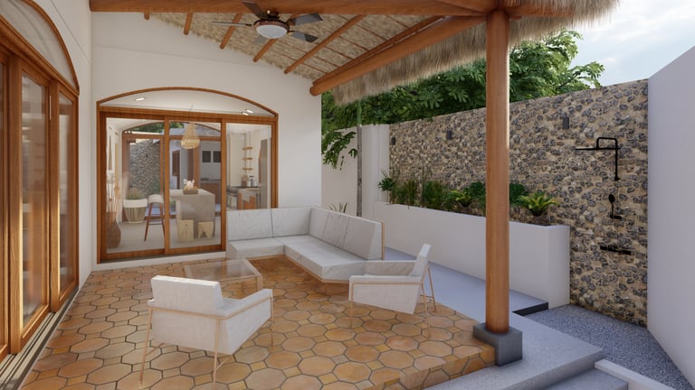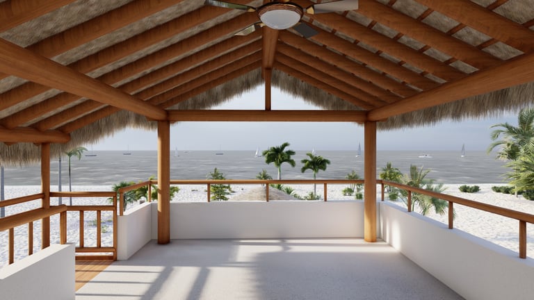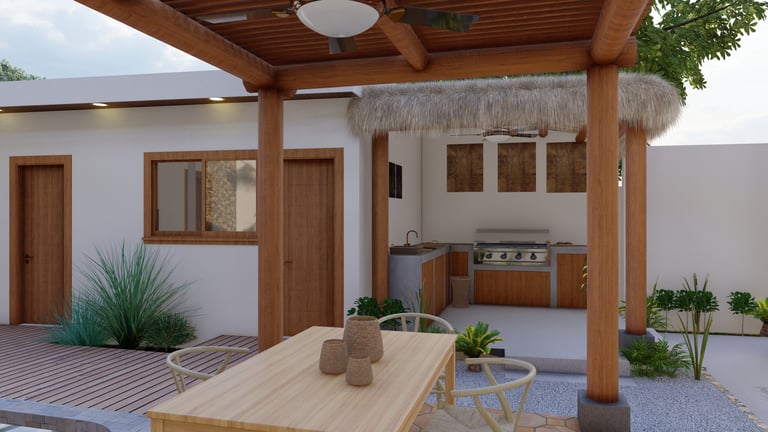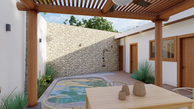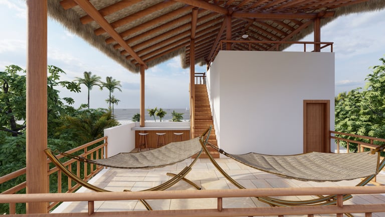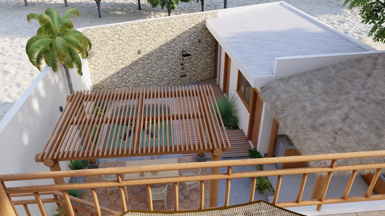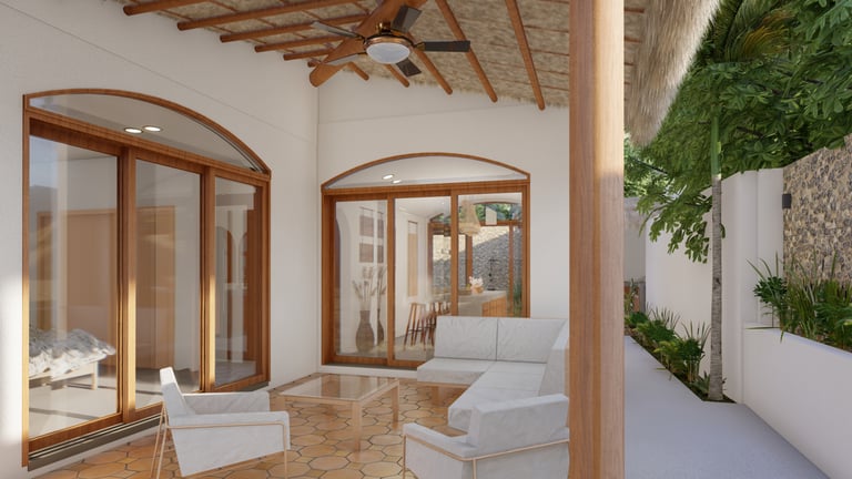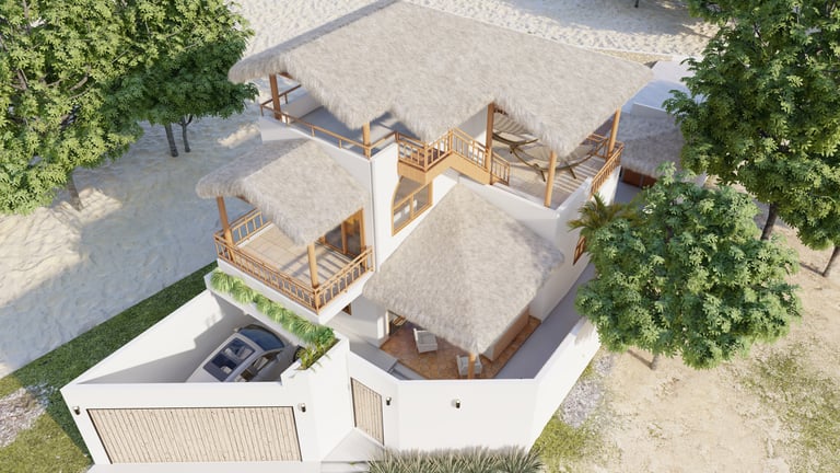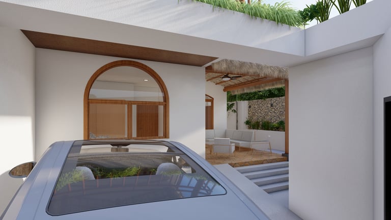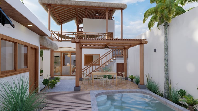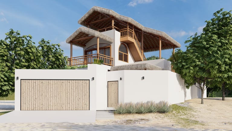 A BEACH HOUSE LOCATED IN MIRAMAR, LEON, NICARAGUA. ONE BLOCK TO THE BEACH. THIS PROJECT CONSISTS OF A TWO-STORY RESIDENCE THAT INCLUDES A FRONT BUILDING WITH 3 BEDROOMS, 2 BATHROOMS, AND A ROOFTOP, AND A DETACHED BUILDING WITH 2 BEDROOMS, A TERRACE, AND A POOL. THE DESIGN INTENT FOLLOWS THE BLENDING OF MEDITERRANEAN AND MINIMALIST STYLES.